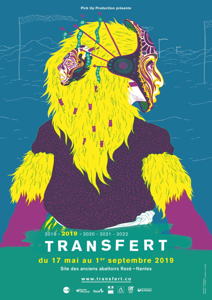 Un triptyque d’affiche est décliné tout au long de l’année : une pour la période mai-juin, une pour juillet-août-septembre et l’affiche ci-dessous pour 2019. Les différences de textures, de couleurs et de personnages marquent ces différents temps qui jalonneront la programmation de Transfert.