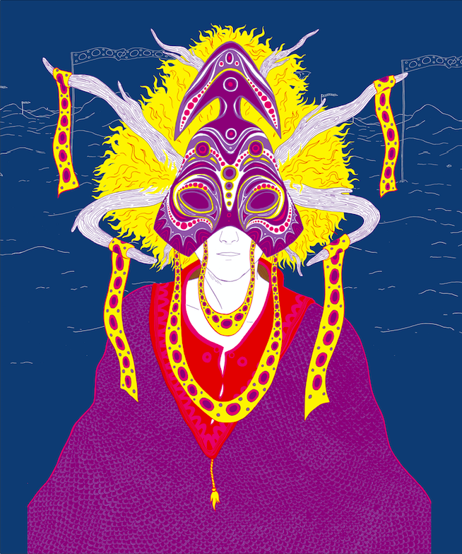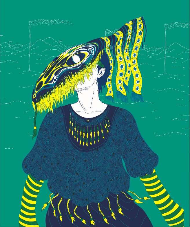 Pour Transfert, elle a imaginé une tribu de nomades qui, après avoir monté leurs premières installations en plein désert, commencent à créer leurs propres coutumes. Futuriste ou classique ? Mérovingien ou zoulou ? Japonais ou amérindien ? À travers les masques de Transfert, chacun·e est libre d’imaginer ses propres références et de créer ses propres histoires.