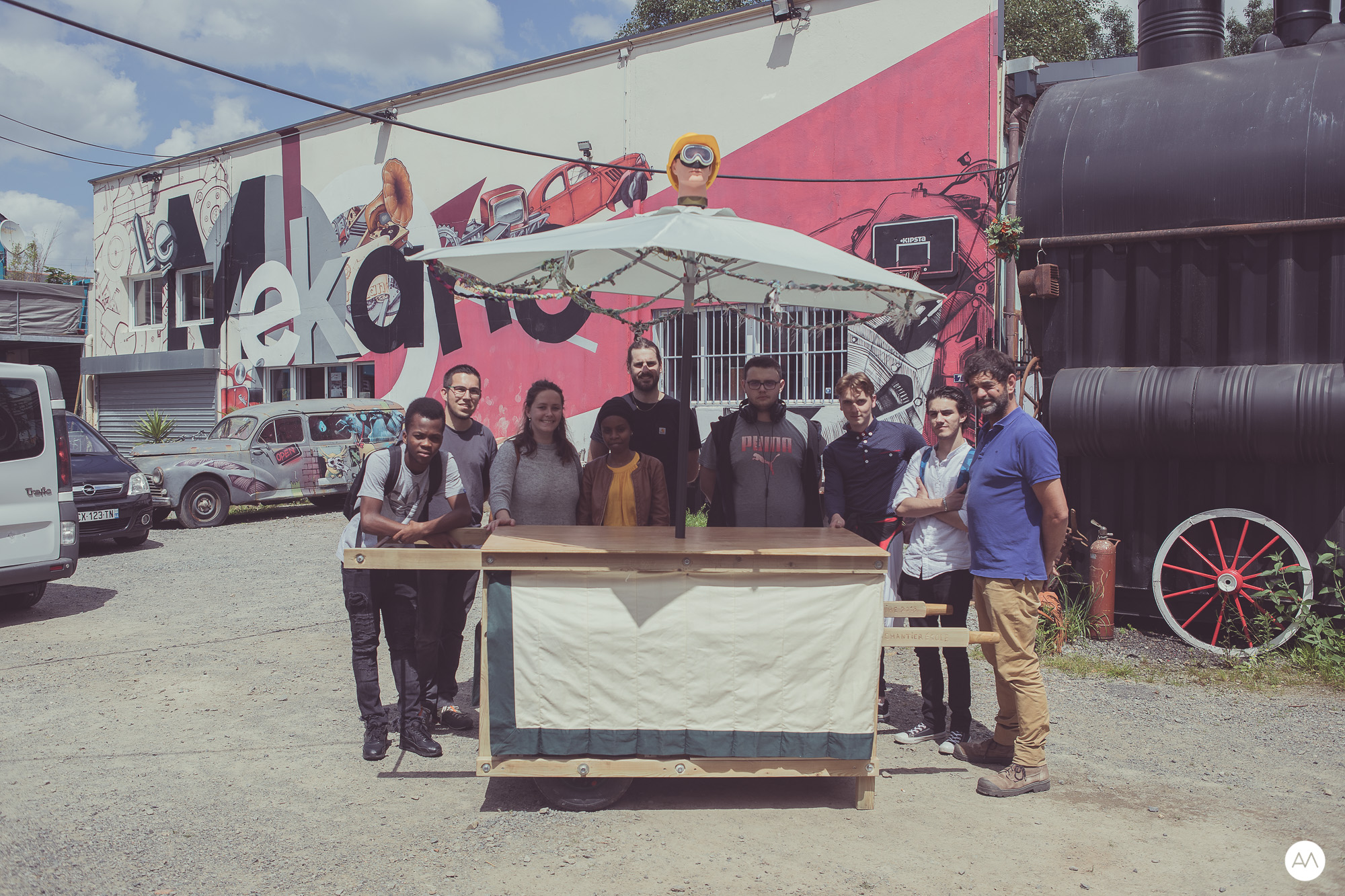 Sur un site de plusieurs hectares avec une programmation pluri-disciplinaire jouant à différents endroits de la base vie nous avions absolument besoin d’un élément mobile pour l’accueil du public. Nous avons donc rassemblé le collectif d’architectes et de constructeurs L’atelier Georges, l’association d’insertion Motiv’action et le magasin Leroy Merlin à 2 pas du site pour concevoir et construire notre fameuse “charette mobile”.
