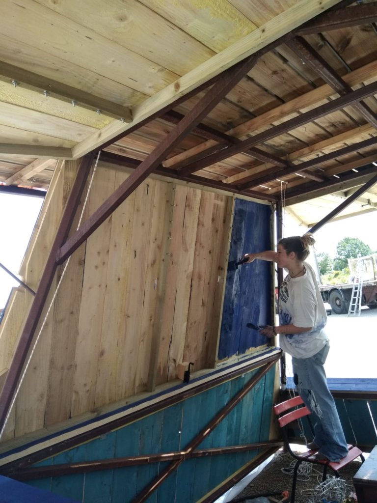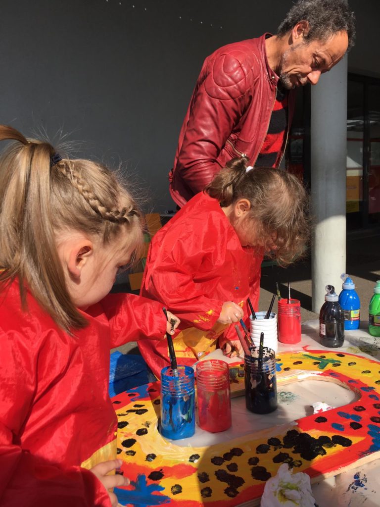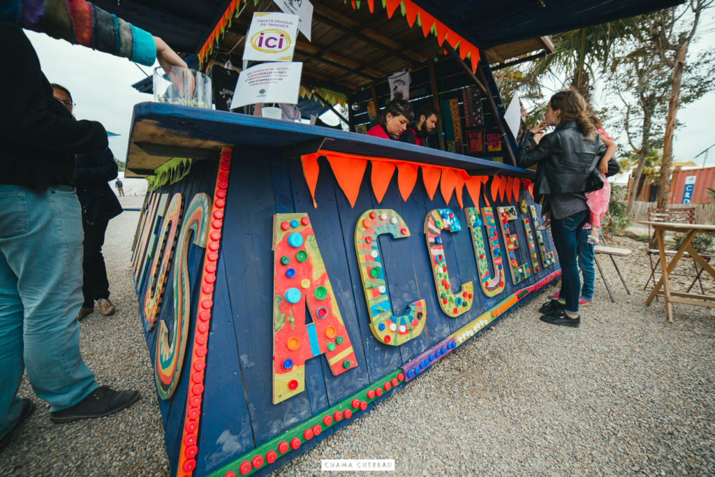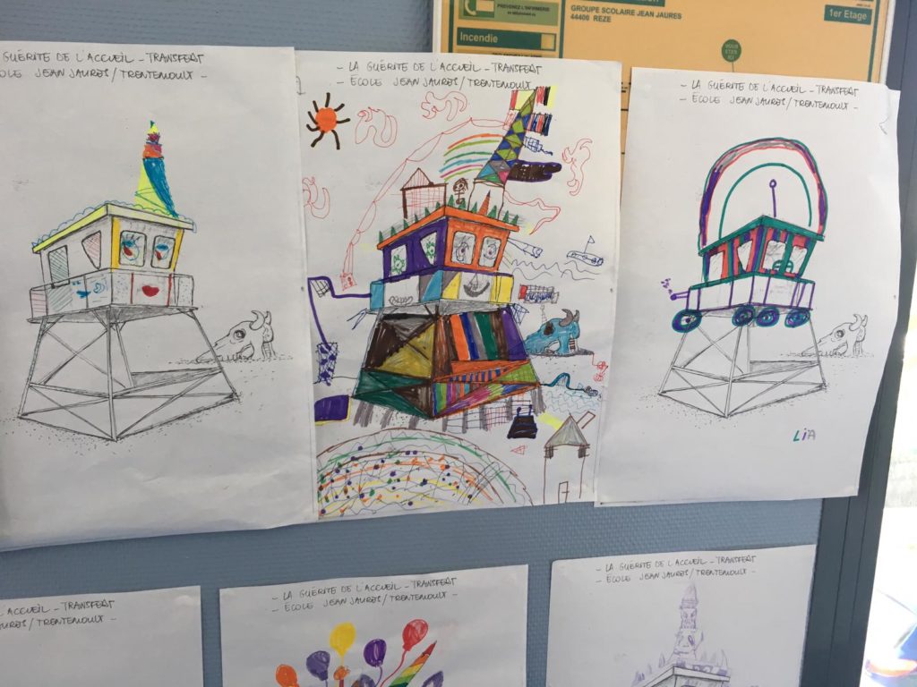 Stations Services collecte les rebuts et chutes de productions des entreprises du territoire, puis les valorise en les proposant aux associations, artistes, particuliers, étudiant·e·s ou bricoleurs. Installée à Rezé, la recyclerie a fourni les matériaux nécessaires à plusieurs chantiers de Transfert, notamment la guérite d’accueil. Du bois a été récupéré, des tuyaux, de la moquette, du lino, des toiles cirées, des plateaux métalliques, du contre-plaqué… Le tout a été peint et décoré par les élèves de l’école Jean Jaurès et le centre Tremeac, sous l’oeil attentif de l’artiste David Bartex.