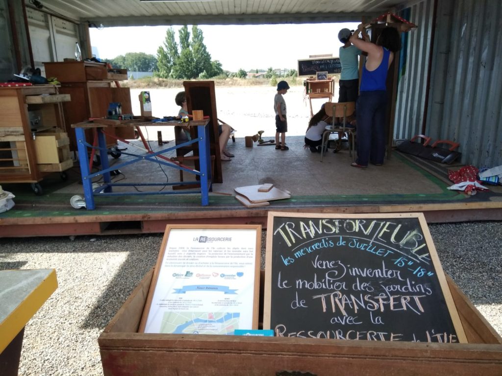 La Ressourcerie de l’île promeut le réemploi et la réutilisation d’objets, de vêtements et de mobilier pour professionnels et particuliers. Partenaire de Transfert depuis l’ouverture, La Ressourcerie anime chaque semaine l’atelier Transformeuble. Tous les mercredis, elle déposait à Transfert une quantité de meubles et objets ne servant plus. Le public était alors invité à leur donner une seconde vie en les détournant ou les assemblant. Un vieux sommier de lit peut alors devenir une pergola, une ancienne horloge devient une bibliothèque, une tête de lit se transforme en banc, etc. Chacun·e est invité à fabriquer du mobilier pour le site de Transfert en laissant parler sa créativité et son talent de bricolo du dimanche.