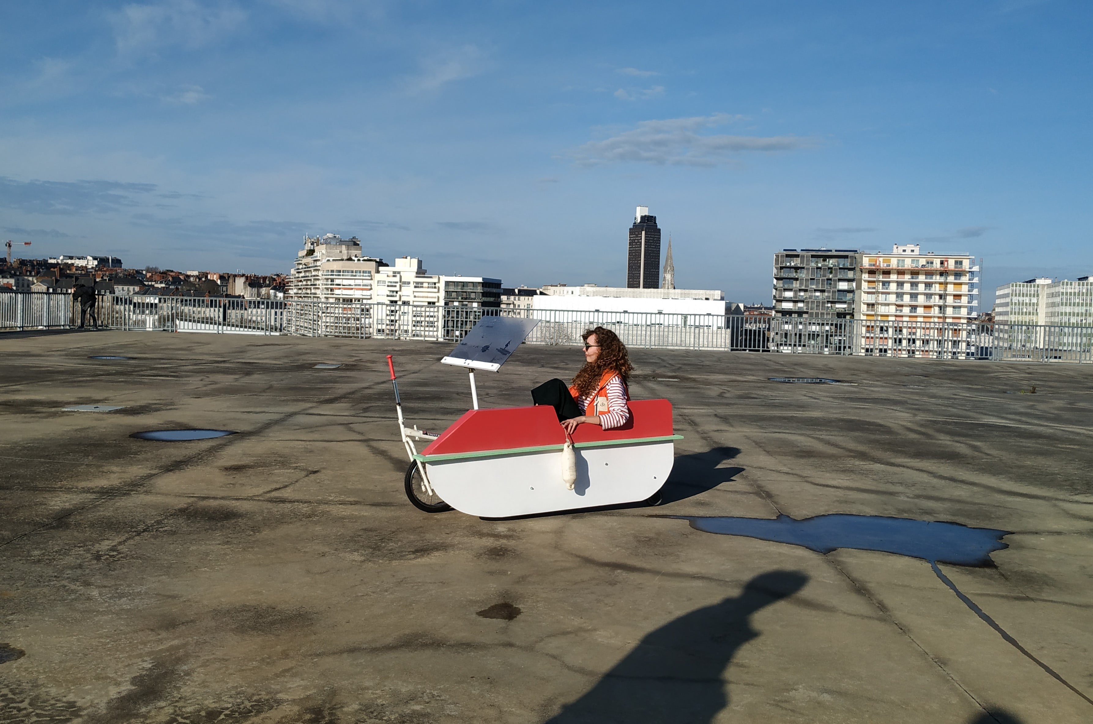 La proposition « Ratiatum-les-flots » quant à elle explore de façon poétique un des aspects historiques du site. Évoquant de manière détournée la présence de la Loire, les étudiant·e·s dans leur scénographie proposent de faire visiter une ancienne cité balnéaire qui aurait perdu son eau suite à un geste tragique : quelqu’un a enlevé la bonde… Le parcours imaginé démarre par la visite de l’ancienne jetée au bout de laquelle on perçoit par anamorphose l’ancienne ligne des eaux. À bord d’un pédalo à sec, avec des lunettes d’exploration immersives, différents dispositifs sont proposés afin de plonger le spectateur dans le passé aquatique de Transfert.