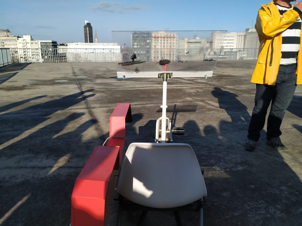 La proposition « Sans dessous de ça » travaille également la notion de miroir en se focalisant sur les effets de renversements, d’éloignements et de détournement que peut apporter un jeu de perspectives. S’inspirant de la traversée du miroir d’Alice aux pays des Merveilles, les étudiant·e·s ont imaginé un dispositif composé de cinq miroirs qui inversent le ciel et la terre, perturbent le regard, changent les focales. Tantôt ce qui est loin devient proche, tantôt ce qui est proche se déforme et s’inverse.