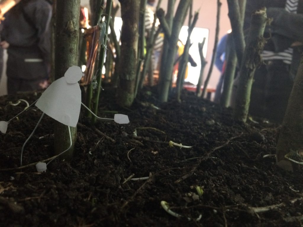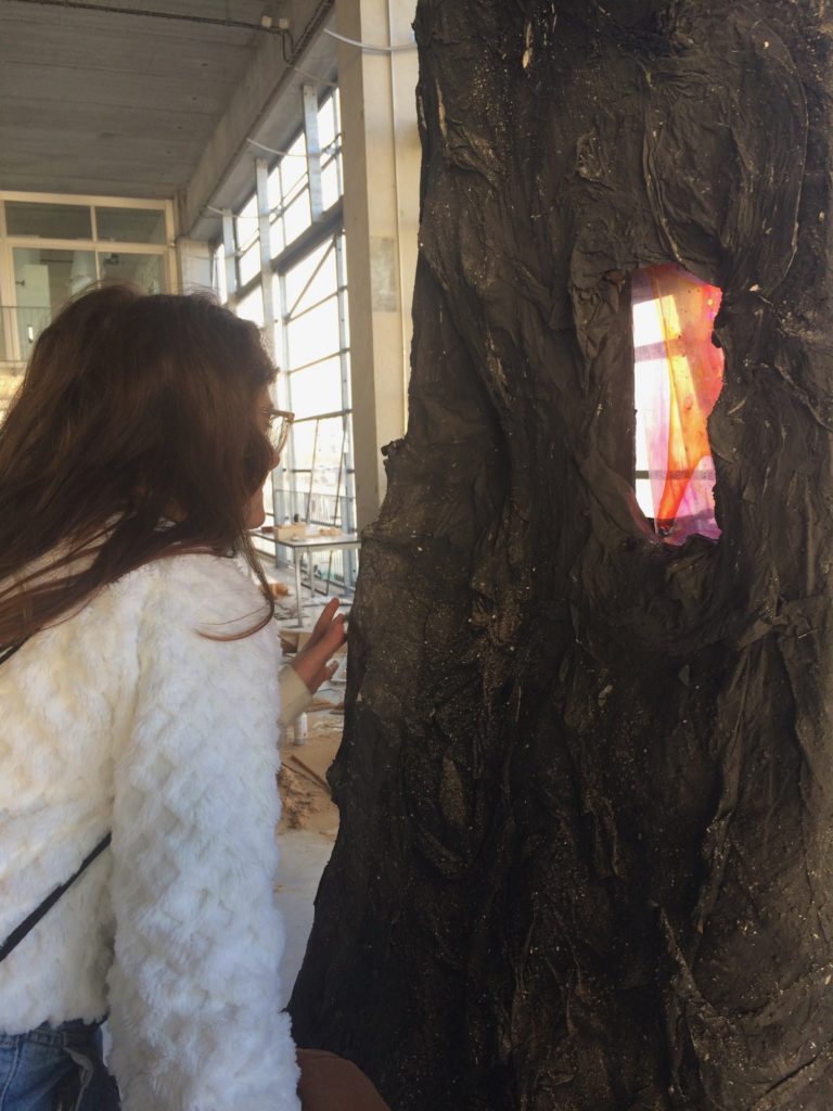 Le projet « Transfert – Faire Trans » avait pour objectif d’amener le visiteur dans une quête initiatique. S’inspirant de l’univers du film Dead Man de Jim Jarmush, les étudiant·e·s ont imaginé installer dans la zone vierge un double de Transfert. Dans cette proposition le public traverse « un bois à illusions », pour ensuite pénétrer sous un abri : prototype de la forme d’un tipi, où le public était amené à s’installer et à contempler un ciel étoilé. L’installation, complétée d’une voix off, amène en douceur le·la spectateur·trice à l’introspection.