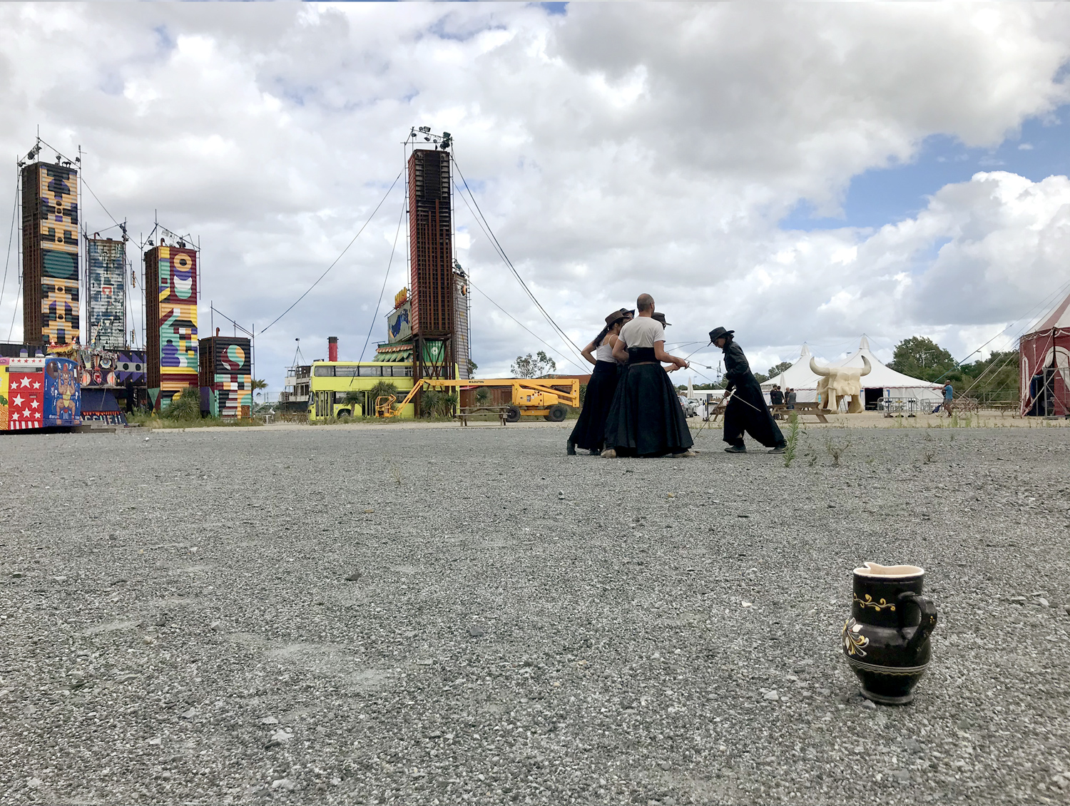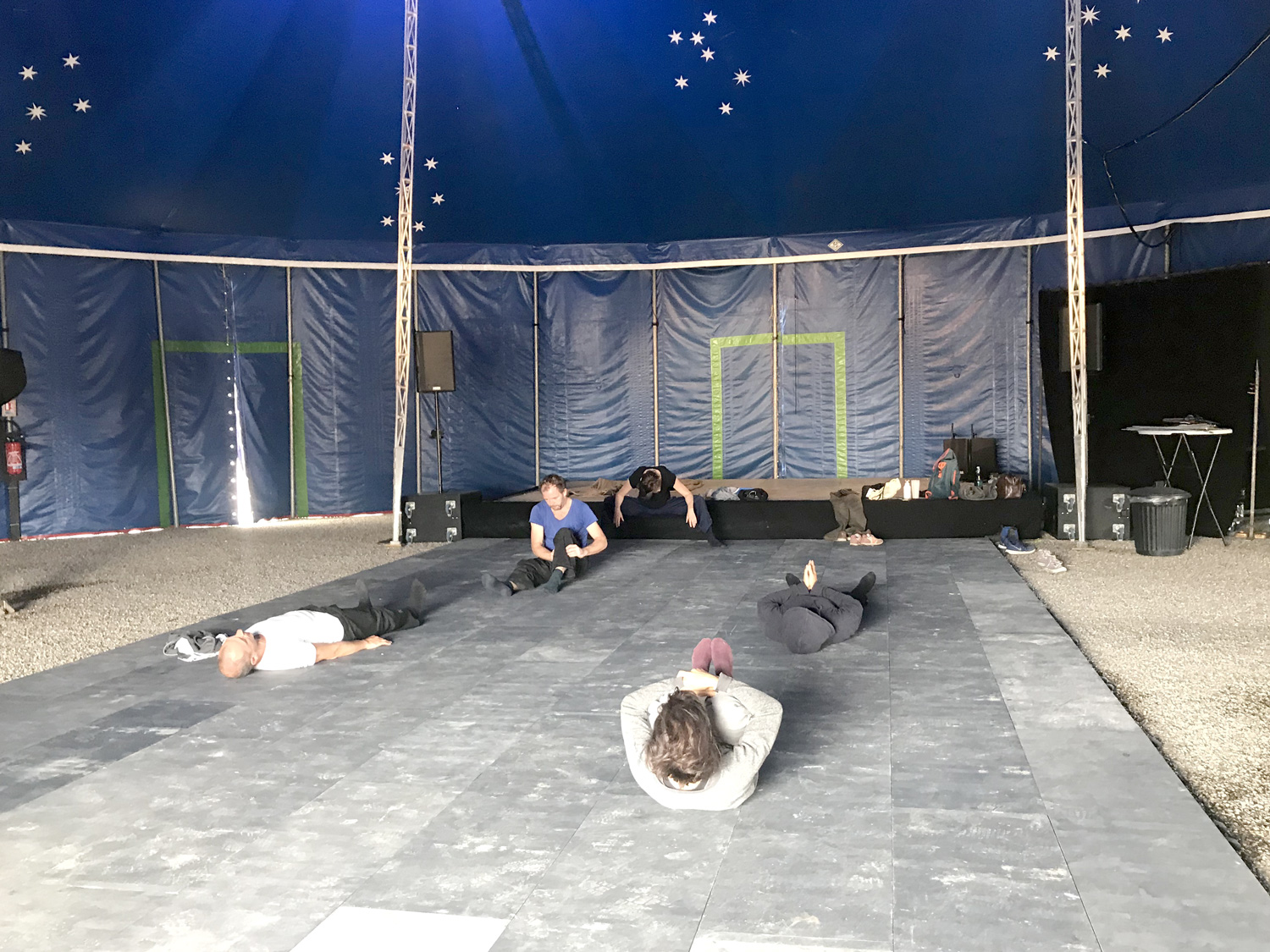 C’est assez étonnant comme espace. Je découvre un espèce de Burning Man nantais, situé au milieu d’un grand terrain vague, avec une rocade d’un côté, des avions qui passent au-dessus… Il y a en même temps une espèce d’effervescence humaine, je trouve ça superbe et surprenant. Pour la résidence, c’est super de profiter du chapiteau et d’un terrain vague sur lequel on peut faire ce qu’on veut. C’est une belle zone de création, d’improvisation. D’autant que quand on improvise dans un espace comme celui-ci, ce dernier a forcément une influence. Ce matin par exemple, on a déliré autour du crâne de vache. Il s’est passé un super truc à ce moment-là, ça va rester gravé. C’est le genre de moment qui déteint sur scène et devient une sorte de mémoire corporelle et collective.