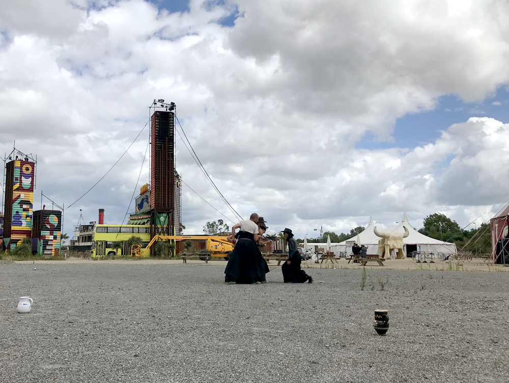 C’est assez étonnant comme espace. Je découvre un espèce de Burning Man nantais, situé au milieu d’un grand terrain vague, avec une rocade d’un côté, des avions qui passent au-dessus… Il y a en même temps une espèce d’effervescence humaine, je trouve ça superbe et surprenant. Pour la résidence, c’est super de profiter du chapiteau et d’un terrain vague sur lequel on peut faire ce qu’on veut. C’est une belle zone de création, d’improvisation. D’autant que quand on improvise dans un espace comme celui-ci, ce dernier a forcément une influence. Ce matin par exemple, on a déliré autour du crâne de vache. Il s’est passé un super truc à ce moment-là, ça va rester gravé. C’est le genre de moment qui déteint sur scène et devient une sorte de mémoire corporelle et collective.