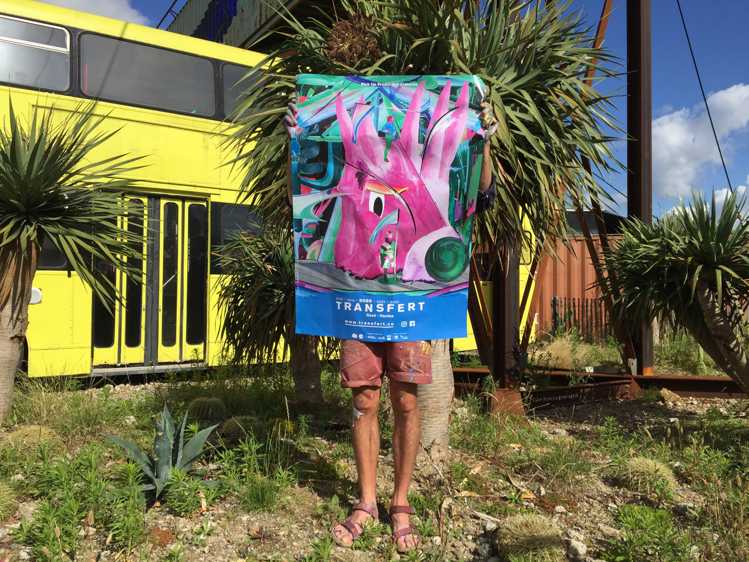 Geoffroy Pithon raconte l’affiche de Transfert : « Nous aimons travailler des images à plusieurs entrées. Il peut s’agir ici d’un portrait, d’une scène de théâtre, d’une aire de jeux… Il y a des éléments en action, une situation : une sorte de sculpture monumentale, mi-tête d’animale mythologique, mi-statut pop géante. La présence des deux personnages est importante, ils s’emparent de cet objet, montent dessus, lui donnent une échelle, des plans, une structure et une grille de lecture. Et à la fois, ils montent la garde, un côté forteresse.