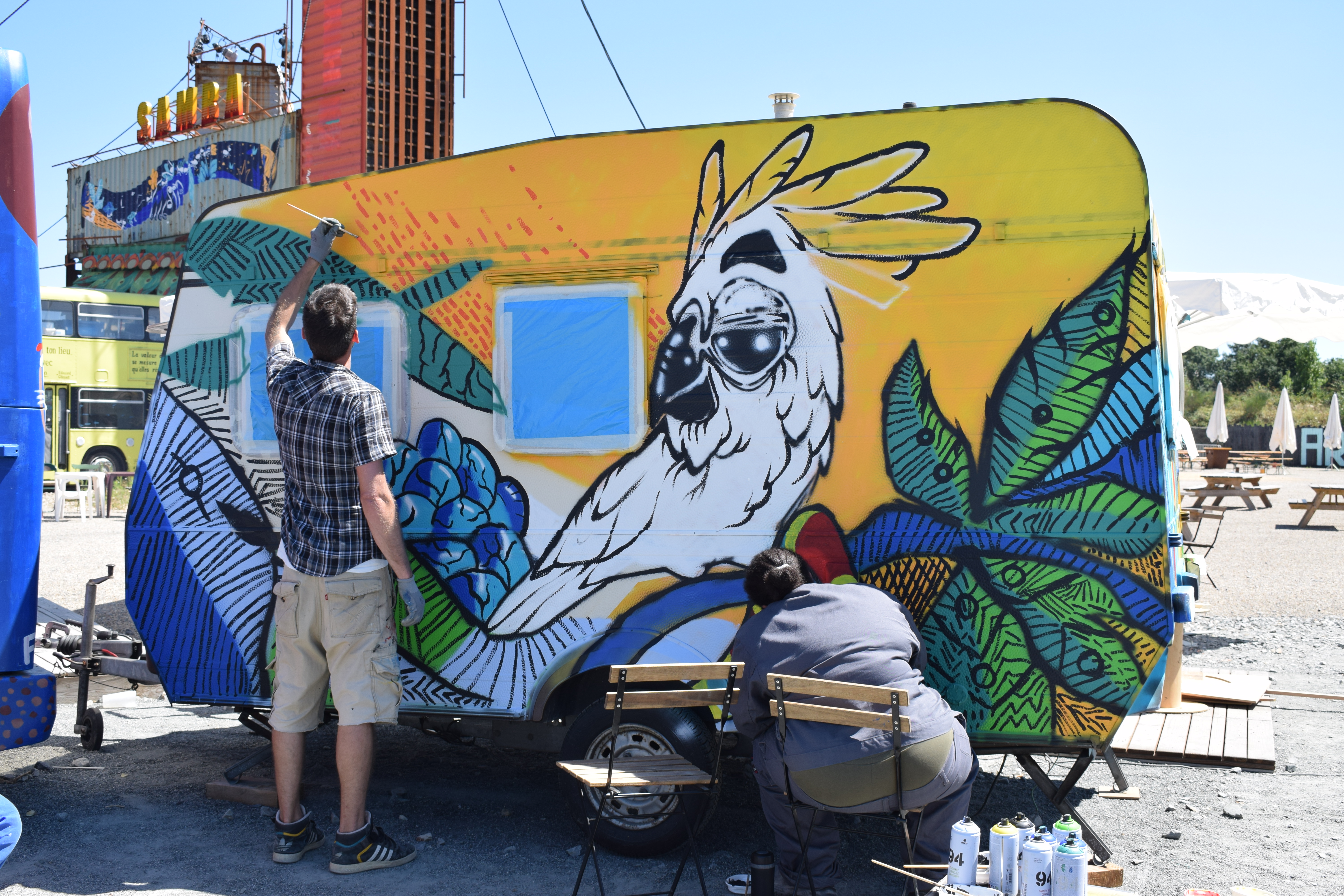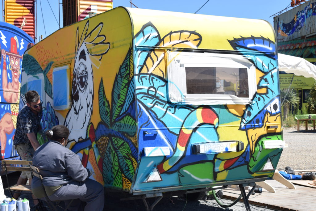 Installée à côté du Bus Bazar, une caravane colorée remplie de livres patiente pour accueillir sur sa terrasse les lecteurs et les lectrices. A l’intérieur, plusieurs centaines d’œuvres attendent leurs âmes-soeurs passagères, sagement rangées sur leurs étagères. Les visiteur·euse·s devraient y trouver leur compte (et leur conte) avec de la lecture pour les petit·e·s et les grand·e·s, du fantastique au thriller, ils peuvent venir s’y poser quelques heures…