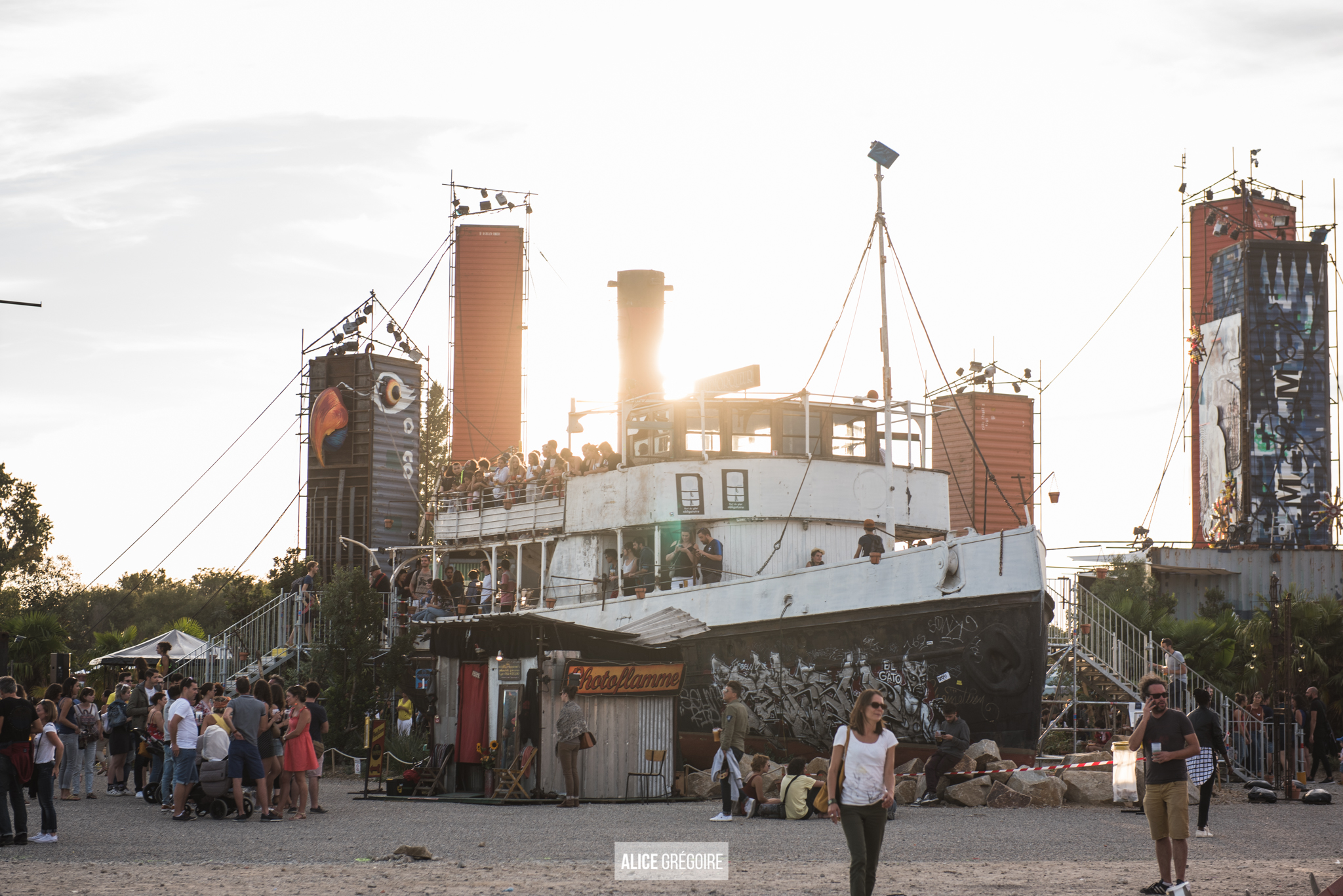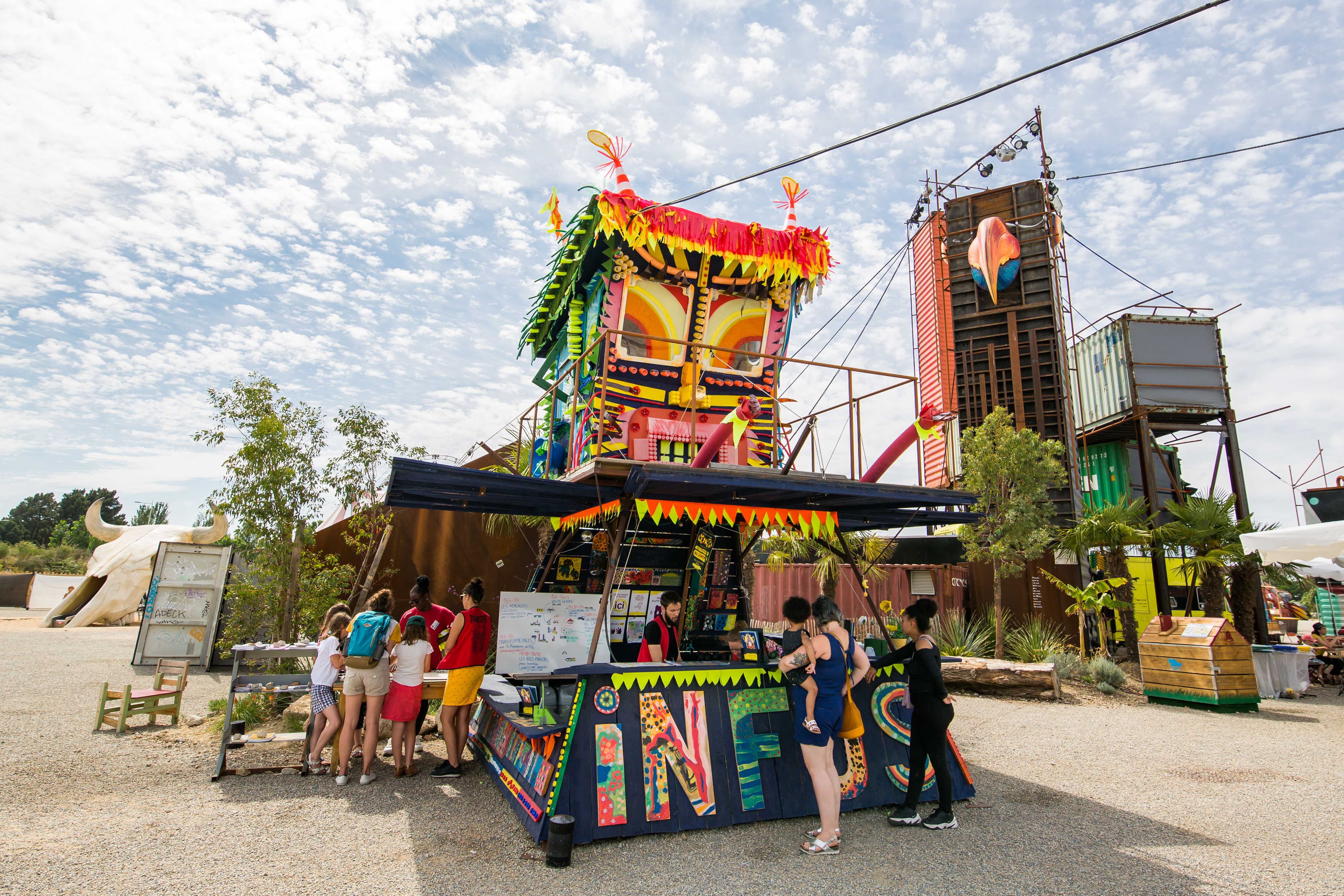 Des conteneurs de marchandises ont été dressés comme des totems, un bateau est venu s’échouer au milieu des chapiteaux, des palmiers côtoient des terrasses, un toboggan en forme de crâne de vache et un étrange bus semblent s’être égarés.
