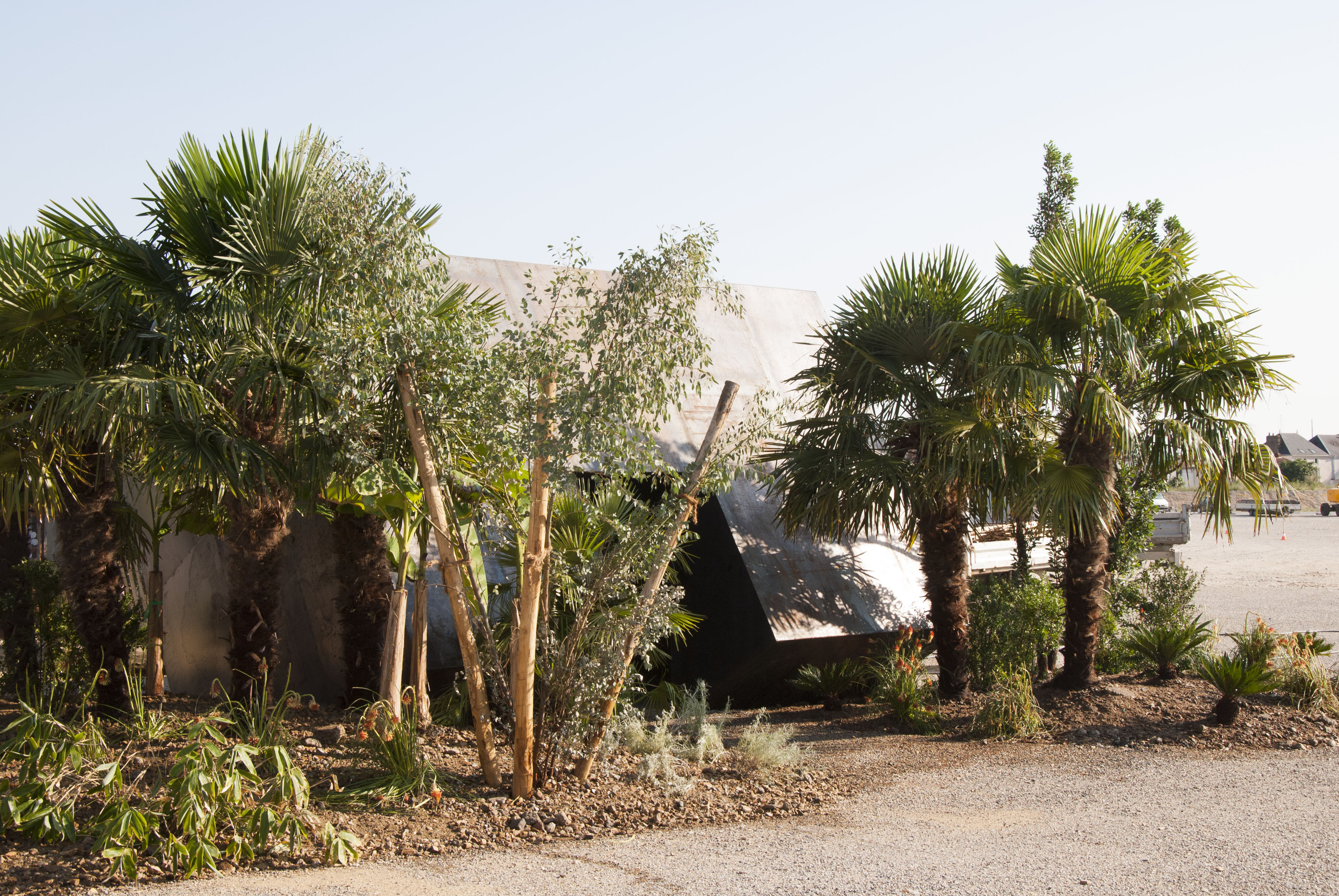 Visible depuis la route de Pornic, l’éolienne indique la direction « Oasis », référence à cette terre désertique récemment adoptée par quelques nomades. Représentation première et brute du réemploi, elle utilise les ressources existantes pour les réutiliser.