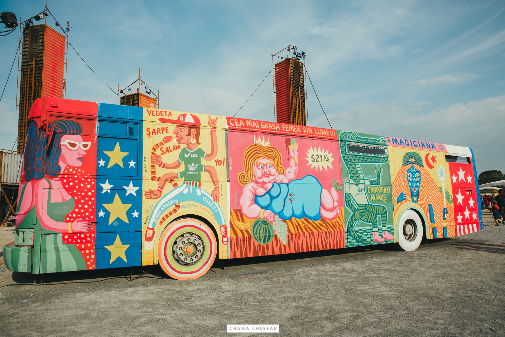 Ce bus-là voyage avec une galerie de personnages de foire, inspirés de l’univers forain et nomade. Tout en couleurs, les Siamois Passion et Amour, le Monsieur Loyal, la Magicienne, la Plus Grosse Dame du Monde, l’Homme Crocodile et l’Homme Fort sont de ceux qui font de leur différence une force.